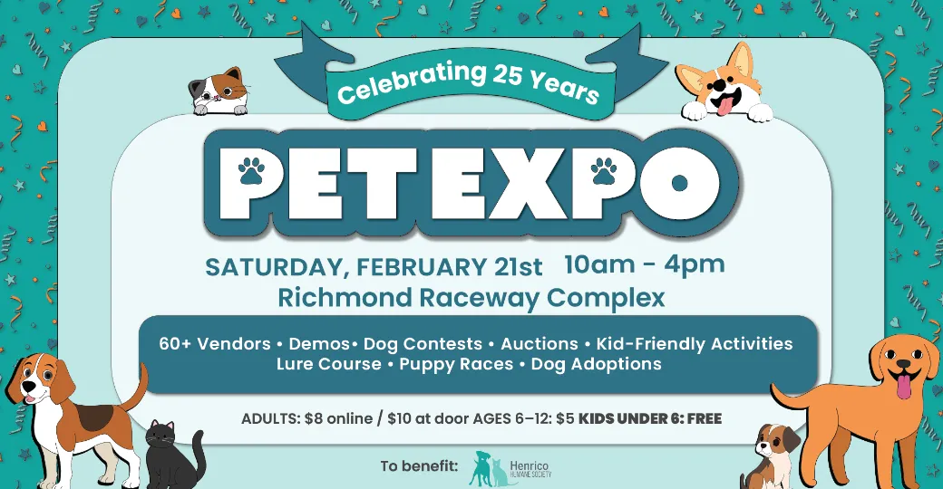 Celebrate pets and the people who love them at the 25th Annual Pet Expo! Join us Feb 21st at the Richmond Raceway for vendors, demos, contests, kid‑friendly fun, puppy races, adoptions, and more. A full day of pet‑powered excitement while supporting local animal rescue.